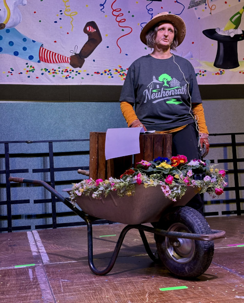 Mit den „Rheinlandsternen“ wurden den Jecken noch einmal feinste tänzerische Choreografie gezeigt, bevor Veronika Wude als „En Frau die jet zu sagen hät“ aus ihrem Leben als Friedhofsgärtnerin berichtete. Bewaffnet mit Schubkarre und Schüppe brachte sie die Halle mit Anekdoten und Tipps zum Lachen: „Wenn ihr mol ene verjrave möt, pflanzt jeschützte Blome dropp! So dorf do an dä Stell keiner mieh jrave!“.